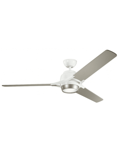 ZEUS Loftventilator udført i et moderne design, fremstillet i hvidlakeret stål og med vinger i børstet nikkelfarvet polycarbonat. Loftventilatoren kan monteres på vandrette og skrå lofter (i kip). Ventilatoren måler 152 cm i diameter og 29 – 46 cm i højde